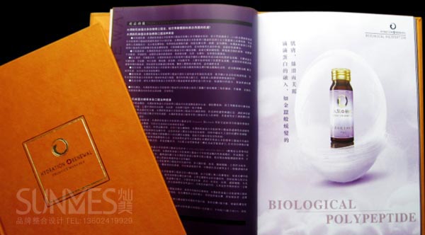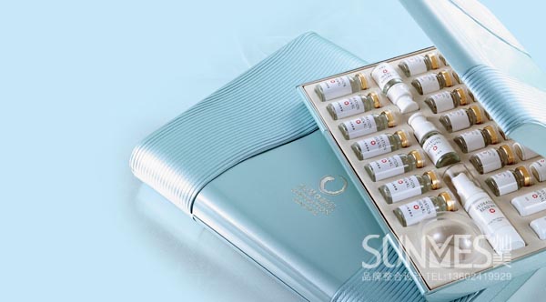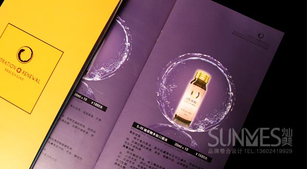化妝品設計案例分 析2–水潤新肌平面畫冊設計:此產品畫冊主要體現口服系列產品,產品價位屬于位高消費人群,品牌宗旨通過高技的多肽產品調理給使用者帶來內在的健康,從而達到 水潤美麗的女人,那么在設計思路上,水便成了整個設計重要元素,關于水的素材有很多,但被使用過無數次,如果就隨便找個素材放上去,太像日化線的補水產 品,體現不了口服產品特色,這時,具有活力、透明質感、高科技、可以勾起喝的欲望水形象便在燦美化妝品品牌設計師在腦海產生了,利用realflow來做 一個水特效,花了一段時間設計制作,出來的效果感覺還是比較滿意,在工藝上我們把這個水的造形一點一滴采用了UV,水形象顯得更加生動,做水潤的女人,更好彰顯品牌生命之水的主題!